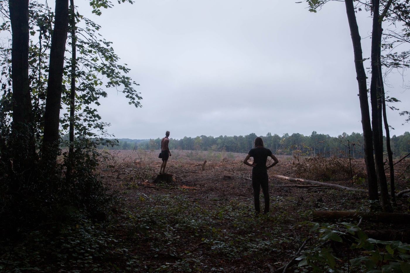 Photo (above): Connor and Peter wandered to the edge of their land to gaze at their neighbor's property, which had just been clear cut, before beginning the morning's work. They live on shared land as part of a radical collective in rural North Carolina. Photo by Mika Chance.
